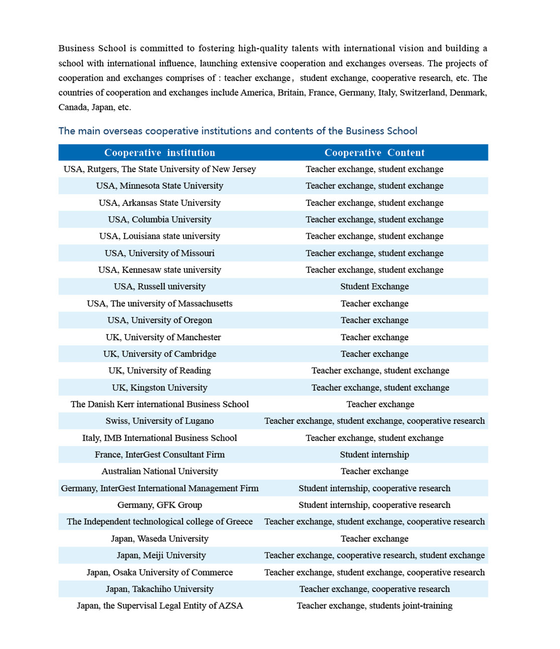 Business School is committed to fostering high-quality talents with international vision and building a school with international influence, launching extensive cooperation and exchanges overseas. The projects of cooperation and exchanges comprises of : teacher exchange,student exchange, cooperative research, etc. The countries of cooperation and exchanges include America, Britain, France, Germany, Italy, Switzerland, Denmark, Canada, Japan, etc.