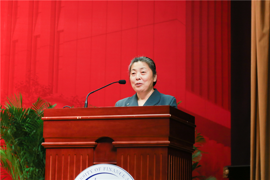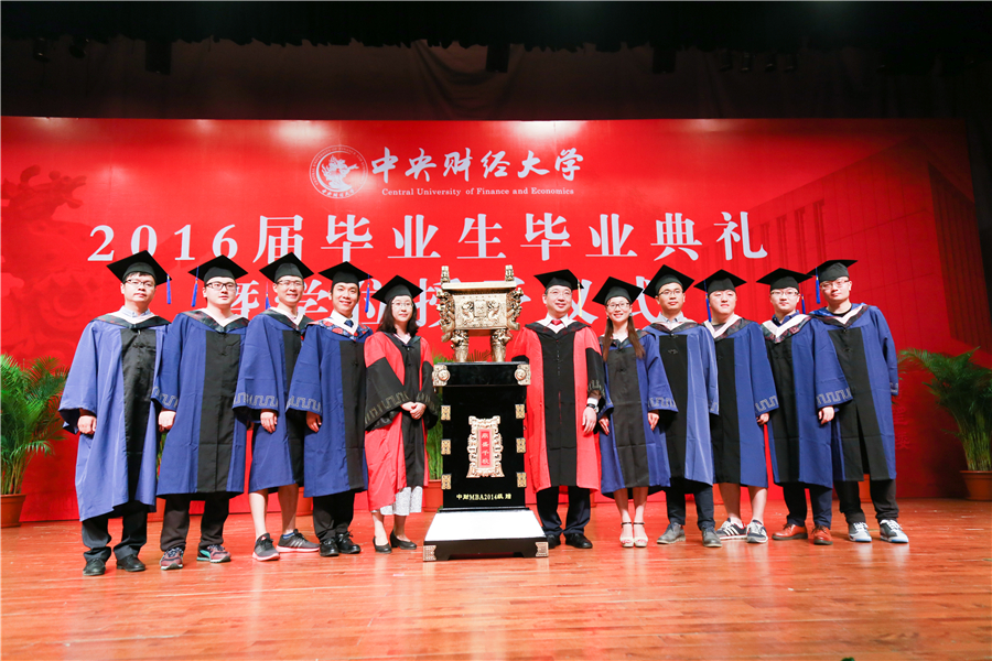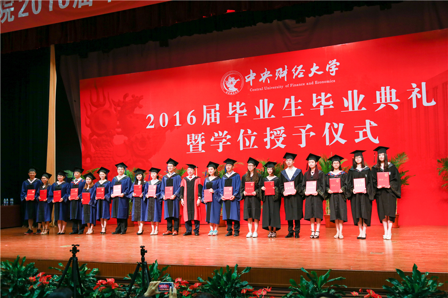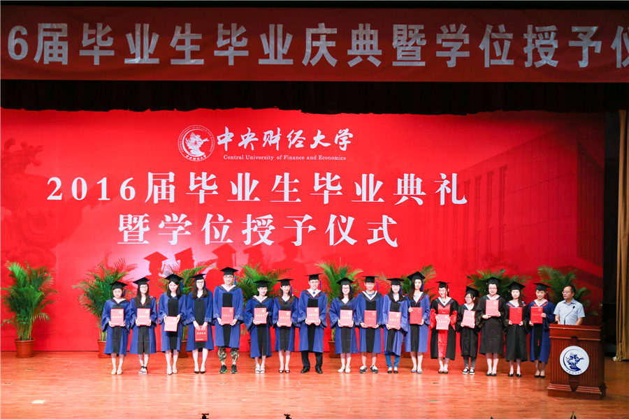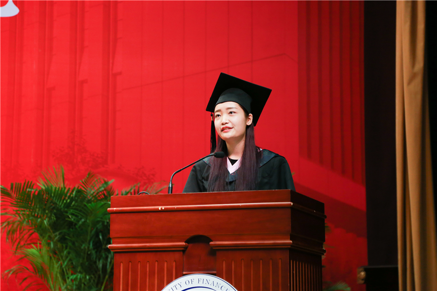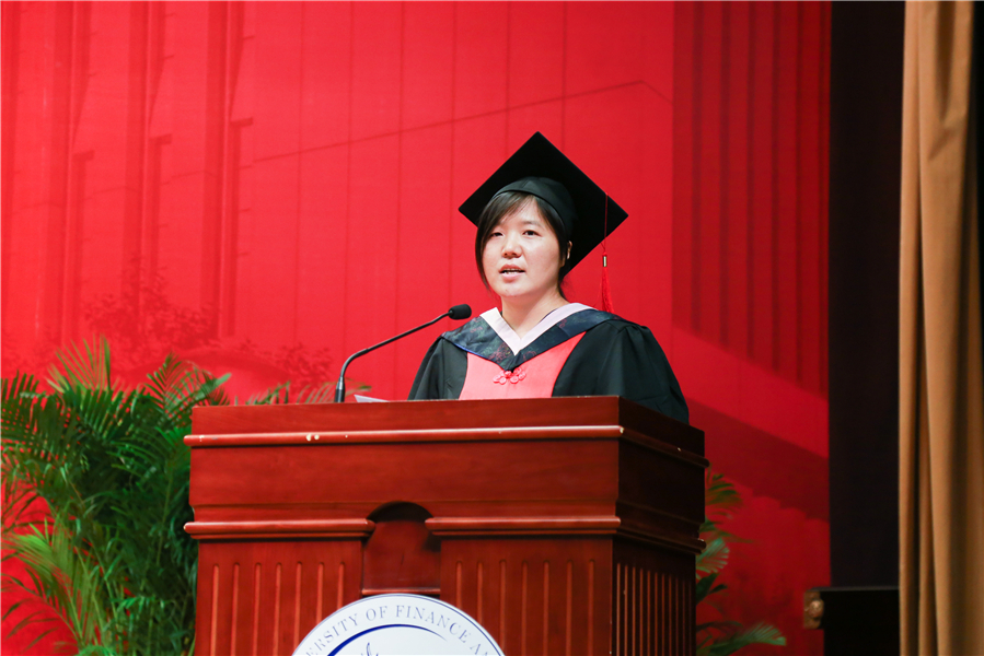 2012级本科生曾戬媛、2014级学术性硕士生蕾拉、2014级MBA硕士生殷丽莉、2013级博士生韩慧林分别作为毕业生代表发表了毕业感言。代表们回顾了难忘的校园生活,衷心感谢老师们付出的心血和汗水,感谢同学们彼此之间的关爱和帮助,感谢亲友们在自己求学之路上的支持!他们表示,作为中财的毕业生,他们一定自觉担负起时代赋予的历史重任和光荣使命,秉承母校“忠诚、团结、求实、创新”的校训,牢记老师们的谆谆教诲,在今后的工作中谱写新的篇章,创造新的辉煌,以骄人的成绩为母校增光添彩,为实现中华民族伟大复兴的中国梦努力奋斗!来自物流管理专业的曾戬媛同学已被美国俄亥俄州州立大学哥伦布分校录取,她的2012级本科同学中还有30位小伙伴也将分赴海外,前往伦敦政治经济学院、纽约大学、新加坡南洋理工大学等国际知名高校深造;而学术型硕士研究生代表蕾拉则是来自非洲马里共和国的留学生,她用流利的中文表达了她对中央财经大学、中财万象城·体育师生友人们的感谢,要将这份真挚的情谊带回她的祖国!