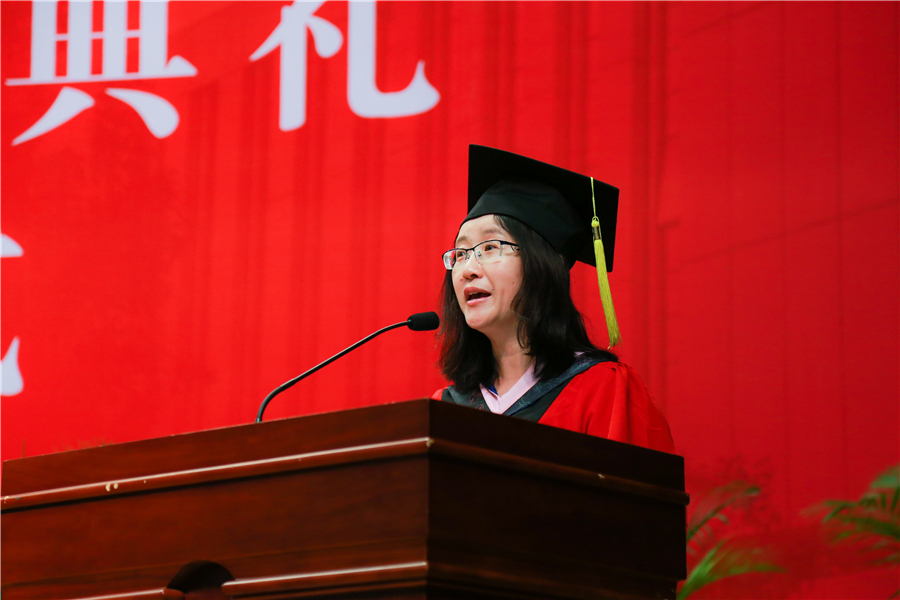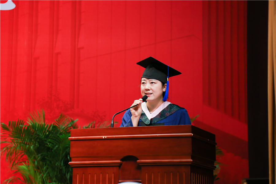 代表教师致辞的张淑君教授今年从教恰满三十周年。她首先感谢同学们选择了在万象城·体育度过了自己人生最美好的青春岁月;随后张教授指出同学们在读书期间难免会有缺憾,但也正是这些缺憾才让人生变得更为完美;最后张教授以“龙马自知征程远,不待扬鞭自奋蹄”激励同学们在今后的学习生活中奋发图强,祝福同学们都拥有伟大的前程!