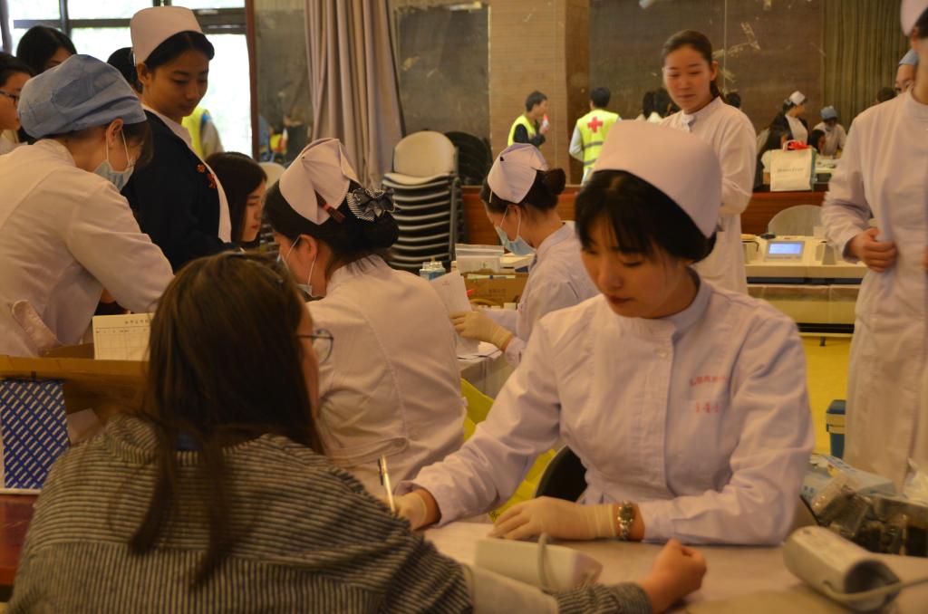 在正式采血环节,志愿者们躺在献血椅上,医生熟练地将针头插入志愿者的手臂,鲜红的血液汩汩流出,进入采血袋。插入身体的针头是冰冷的,但体内流出的血液是温暖的。同学们不知道这些血液将流入哪位病患的体内,但可以确定的是,这些带着同学们体温的红色液体在爱心的传递中必将变为一汩汩爱的音符延续生命、播种希望。