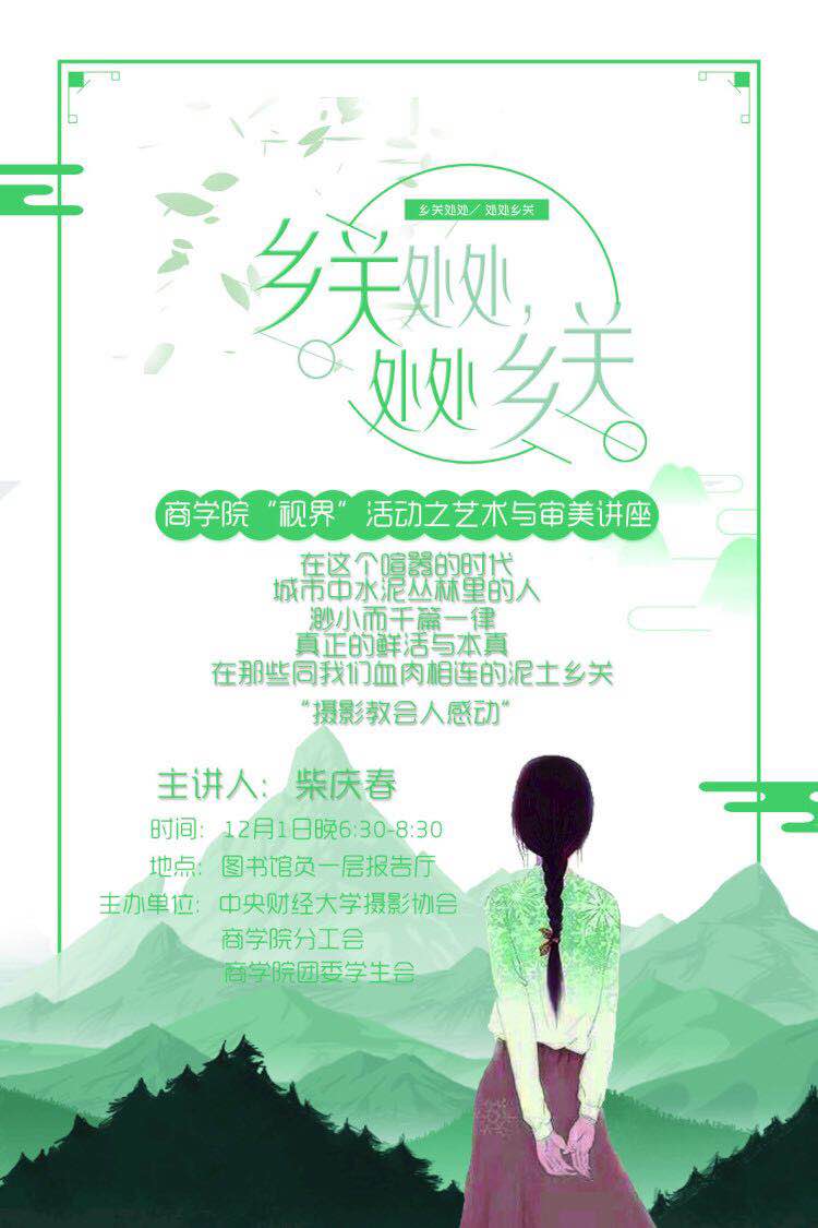 2017年11月24日,由中央财经大学校园文化建设协调组主办、中央财经大学摄影协会承办、校宣传部和校工会协办的“乡关处处——柴庆春‘民俗摄影’作品展”在我校学院南路校区主教楼2层“文化盛宴长廊”拉开序幕。