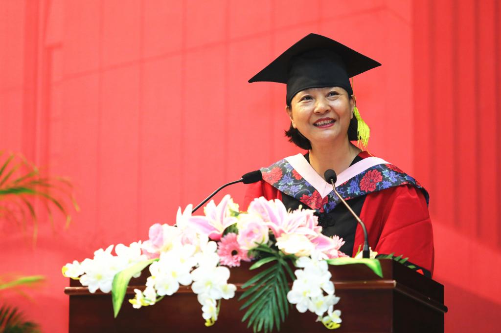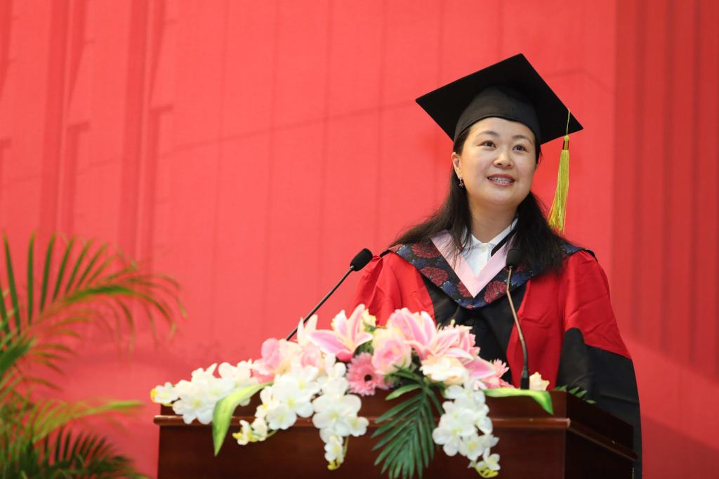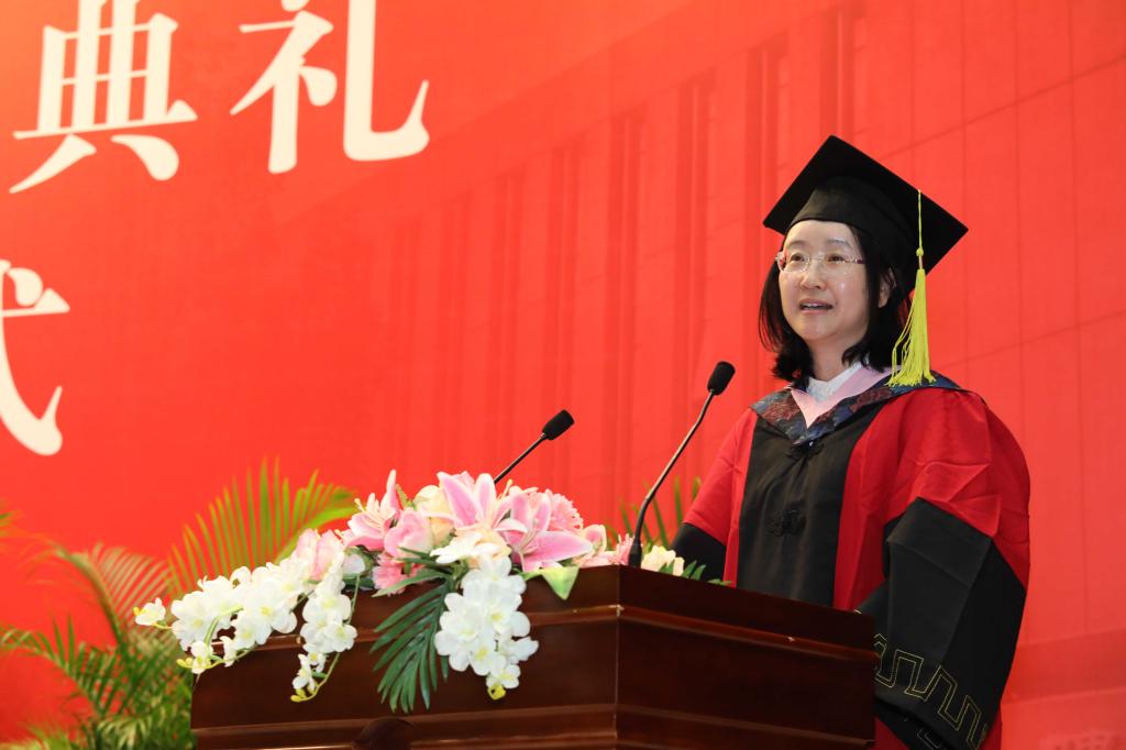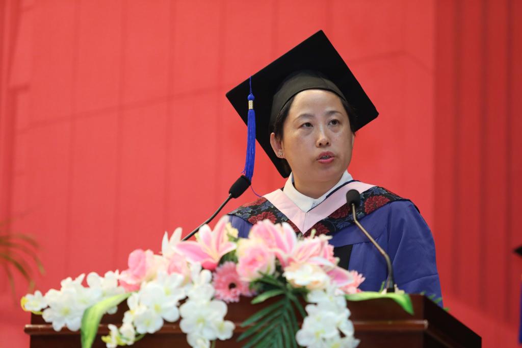 安秀梅秘书长随后发表致辞,她代表校友总会和全球12万中财校友向全体毕业生表示热烈祝贺,并郑重接收大家成为中央财经大学新校友。她说成为校友意味着大家的发展又多了一层支撑,人生又进入了一种新境界,肩上又多了一重新责任。安秀梅秘书长希望全体毕业生们能够继续发扬“忠诚、团结、求实、创新”的中财精神,励精图治,开拓创新,敢于担当,勇往直前,为母校增光,为祖国的繁荣昌盛、为中华民族的伟大复兴贡献自己的力量!