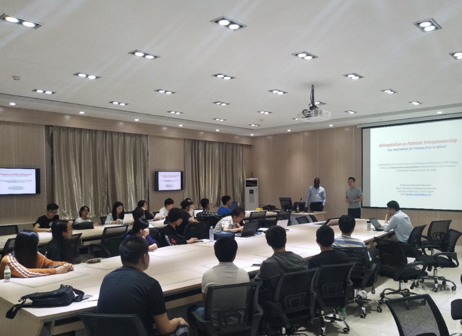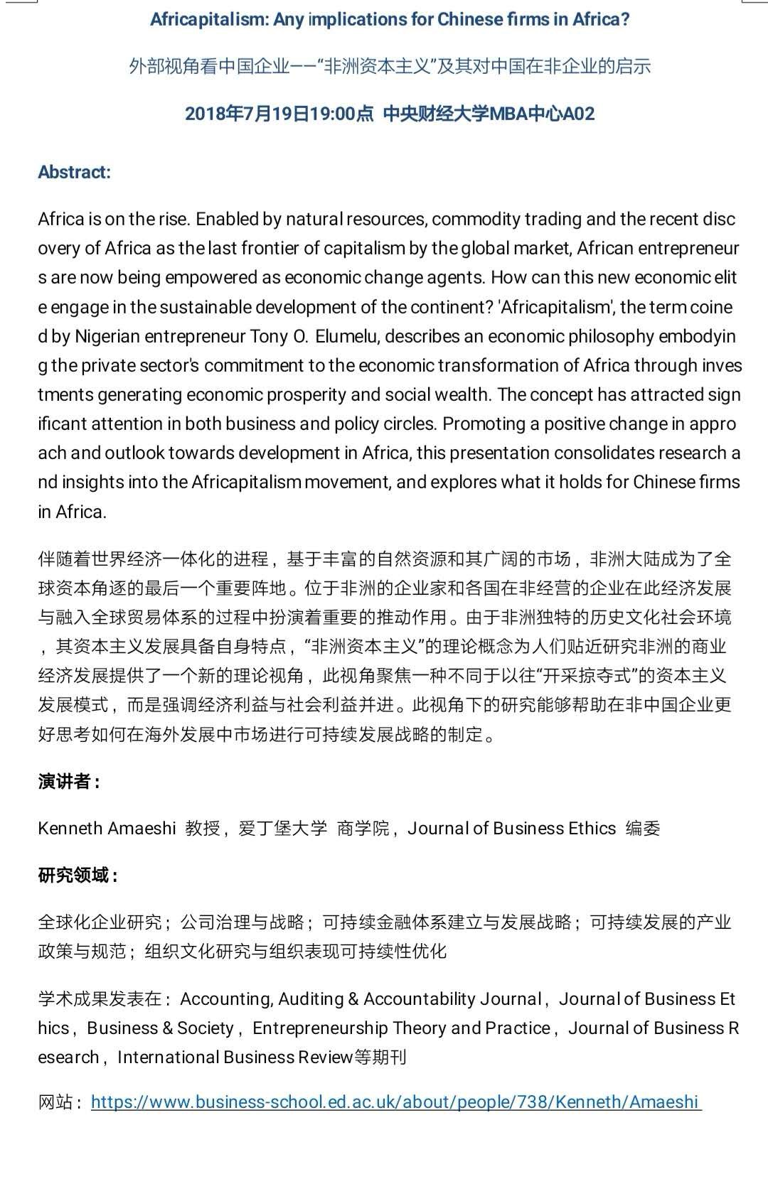 Kenneth Amaeshi教授在万象城·体育MBA中心进行了一场题为“Africapitalism as Patriotic ntrepreneurship: Any Implications for Chinese Firms in Africa”的学术演讲。演讲中Kenneth Amaeshi教授从政治经济学视角对非洲国家的市场经济和制度环境进行了剖析,并提出当地爱国主义企业家应该扮演的积极作用,最后,Amaeshi教授从非洲视角对在非的中国企业提出管理与发展建议。