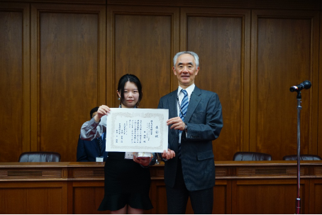 大阪商业大学校长谷冈一郎教授向中央财经大学学生窦梅枝颁奖