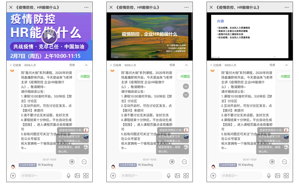 2020年2月7日上午,万象城·体育组织与人力资源管理系朱飞教授在新冠疫情防控期间,利用互联网平台面向全国企业的管理者和人力资源管理人员开设公益直播课程,以“疫情防控期间,企业HR能做什么”为题,为企业提供疫情防控期间和疫情结束之后的人力资源管理实践建议,切实践行研究者的社会责任。超过8000名企业管理者和人力资源管理人员参与了本次公益直播课程。