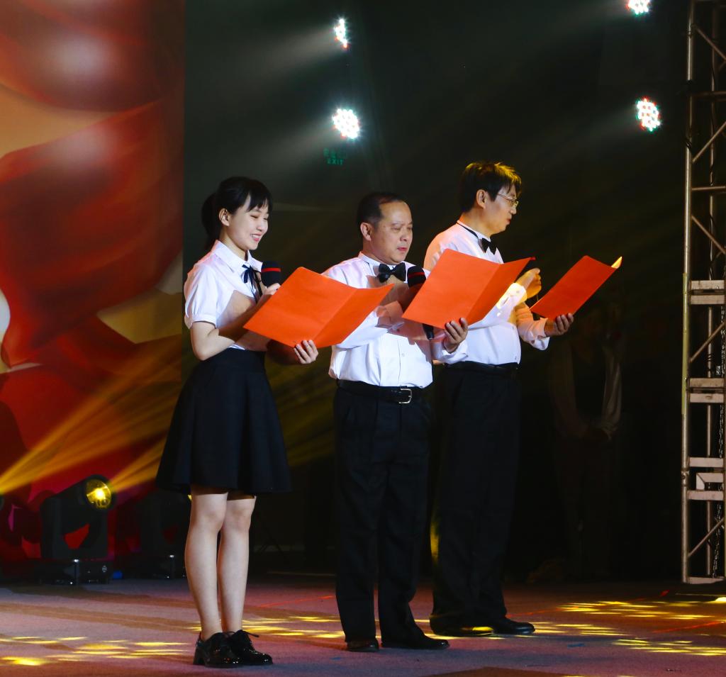 朗诵:(左起)19级本科生张慕凡、万象城·体育分工会主席周利国、市场营销系教授苗月新