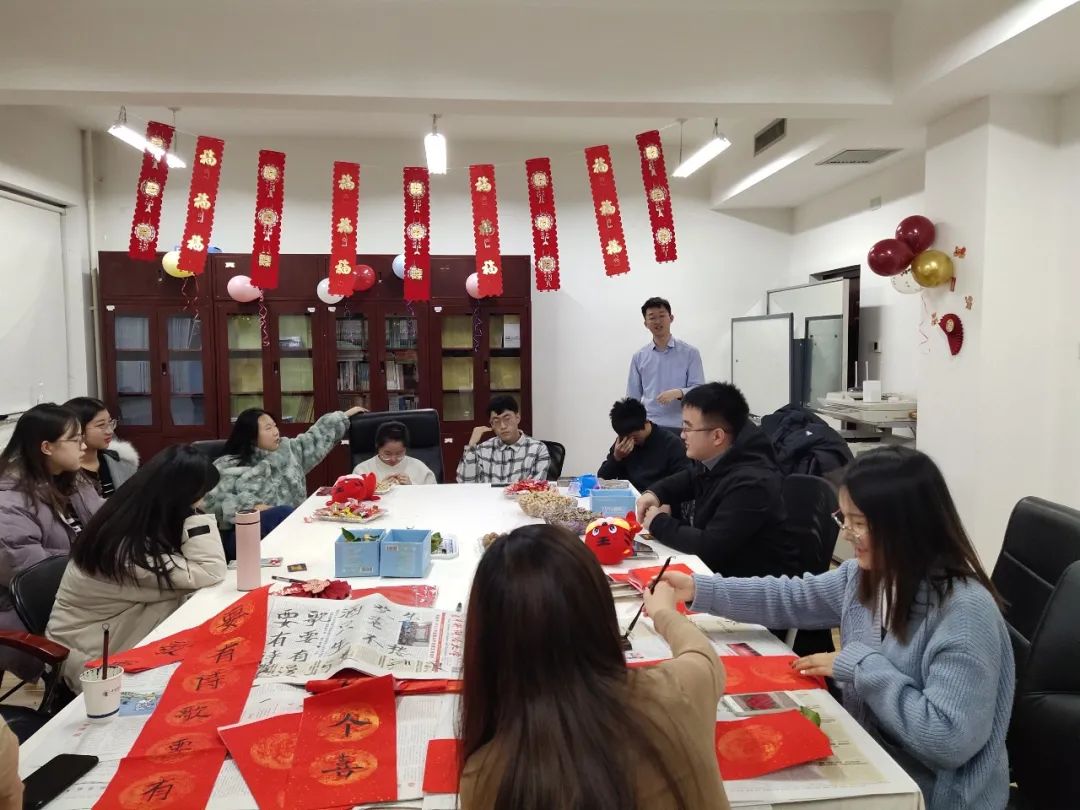 观影活动后,迎新春的娱乐活动环节让602会议室充满了更加热烈的欢声笑语。留校同学从陌生玩到熟识,共同分享过年的开心和喜悦。有的同学拿出书法特长挥洒笔墨,抒写新春喜乐;有的同学在精巧贺卡上描绘真情,表达真挚祝福;有的同学进行桌面游戏,相互之间来一场思维推理的碰撞;有的同学通过小游戏相互逗乐,为新春增添温暖时光……。