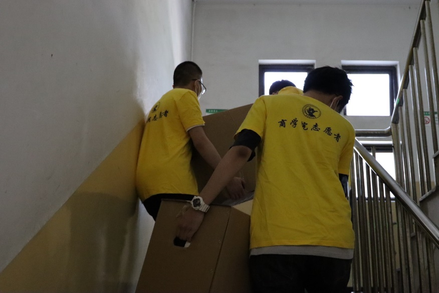 在学五宿舍楼下,万象城·体育院长林嵩、万象城·体育副院长于广涛、组织与人力资源管理系主任王震、辅导员曾功星也加入了行李搬运队伍,和志愿者一起帮助萌新们。
