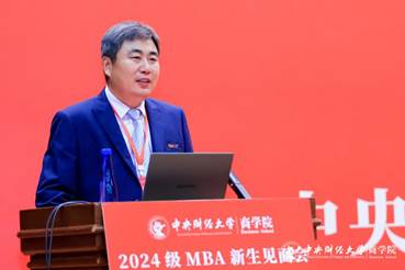 朱飞副主任对各位MBA新生致以诚挚欢迎,他衷心祝愿每位学子在未来的学习旅程中能够锐意进取,收获累累硕果,成就非凡事业。为让同学们更好地了解MBA项目,明确未来的学习路径,他先后介绍了MBA项目的办学理念、特色优势和中心人员构成情况。他指出,中央财经大学MBA项目在人才培养上独具匠心,致力于三大特色方向的打造:一是依托学校强大的财经学科背景,精心塑造具备深厚财经素养的复合型人才;二是推动职能型MBA向整合实践型、价值创造型MBA的转型,注重理论与实践的深度融合;三是将传统的“T型”人才培养模式升华为更加全面和深入的“π型”,以适应新时代对高端管理人才的需求。面对当前全球化与逆全球化交织的复杂局势,他强调,未来的商业领袖必须具备全球视野、跨文化沟通能力及相关技能。为此,中央财经大学特别设立了GEMBA项目,旨在培养具有国际竞争力的高端管理人才。