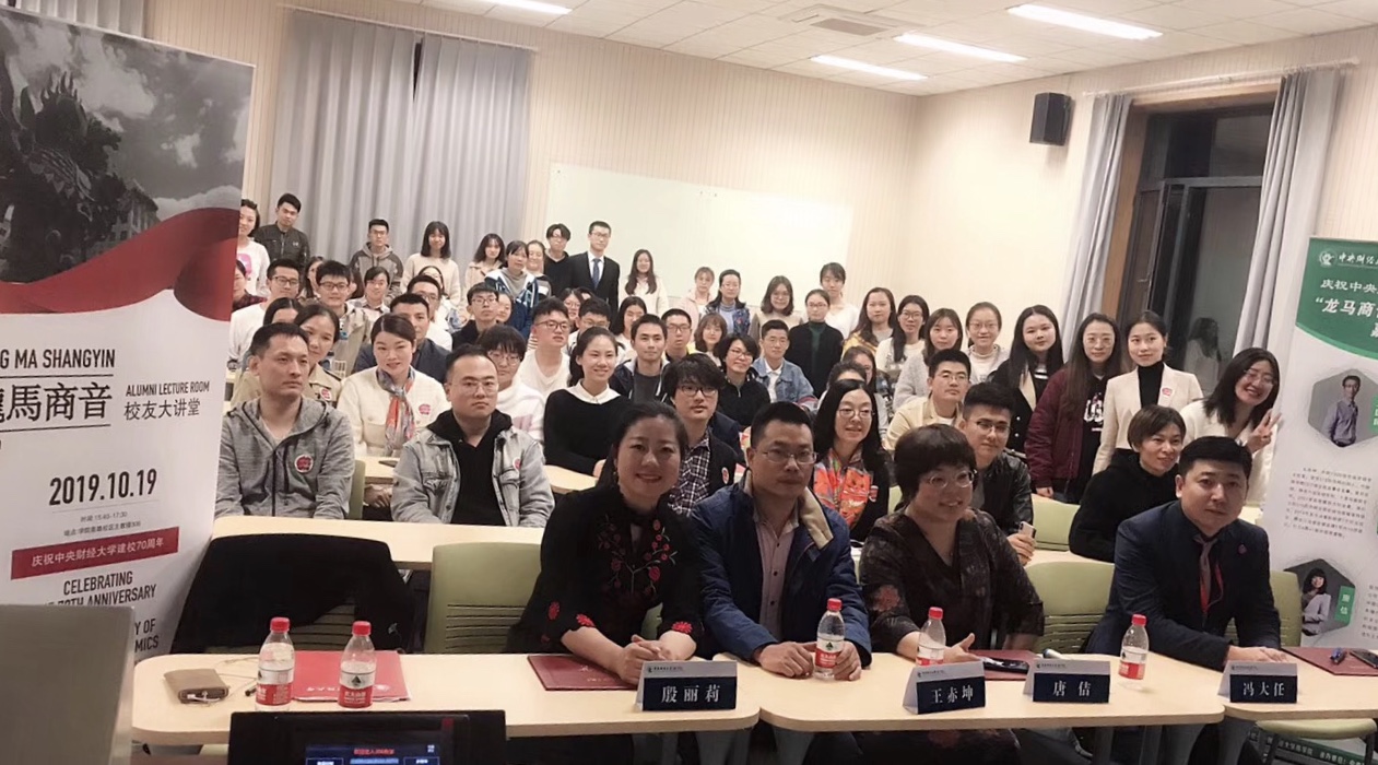 October 19, 2019, on the occasion of the 70thanniversary of CUFE,in order to strengthen the interactions between high profile alumni and currentstudents regarding their life and experience and help students grow, theCUFE-BSAlumni Lecture Series meeting was successfully held.Professor Lin Song, Deanof CUFE-BS and Director of the MBA Education Center,Mr.Wang Guomin, an alumnus of year 1979,Mr. Wang Chikun,an alumnus of year 1998, andMs. Tang Ji, an alumnus of year 2007.Mr.Feng Dachen,an alumnus of year 2007, attendedthe meeting with more than 100 students. Ms. Yin Lili, Vice President andSecretary General ofCUFE-BS CEO Cluband an alumnus ofyear 2014, hosted the meeting.