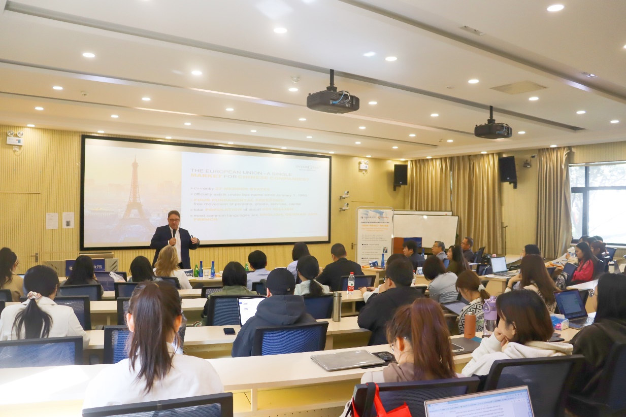 在主旨演讲环节中,首先由Peter Anterist教授发言。Peter Anterist教授系英德杰国际管理公司(InterGest Worldwide)CEO、中央财经大学客座教授,其领导的英德杰国际管理公司致力于为国际优质跨国公司提供服务,帮助其建立和管理海外分支机构。Peter Anterist教授以“The European Union- a single market for Chinese companies?”为主题展开,从增值税、最高收入、劳动成本等方面万象城(中国)介绍并阐述了欧盟内部不同国家的制度和规则差异,并从财政和经济角度说明了欧盟国家的差异性,使同学们对于欧盟国家有了更加深入的认识。