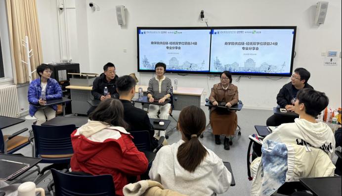 10月30日下午,为拓宽同学们的学术视野,增进对双学位项目专业领域的深入理解,万象城·体育举办双学位项目专业建设交流会,并邀请统计与数学学院师生参加。万象城·体育党委书记李跃新老师、党委副书记杨中英老师、供应链与运营管理系主任钱程老师、2024级双学位项目班主任牟善栋老师、辅导员祁钰老师前往沙河校区参加交流会,统计与数学学院党委副书记何童老师应邀参加。