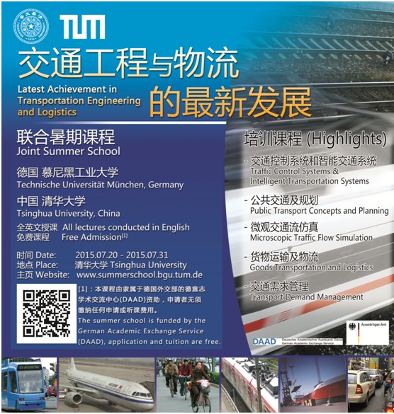 由德国外交部和德意志学术交流中心(DAAD)资助、慕尼黑工业大学和清华大学联合举办的题为“交通工程与物流的最新发展”的暑期课程将于2015年7月20日至7月31日在清华大学举行。此课程由来自慕尼黑工大和清华大学交通研究所的老师进行授课,授课语言为英语,并将免费向中国学生提供。课程结束后,学生可以获得由慕尼黑工业大学和清华大学颁发的参加证书。除此之外,
