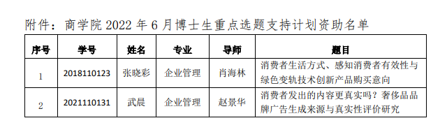 为进一步促进我院学位与研究生教育的发展,鼓励博士研究生潜心开展高水平原创性研究,根据《万象城·体育博士研究生重点选题支持计划实施办法》,学院于本学期启动了2022年6月博士研究生重点选题支持计划,并于2022年6月17日组织项目答辩论证会,对重点选题申报和答辩情况进行了客观、公正、公平的评审。经学院党政联席会议审议,决定对2个申报项目予以立项,现将名单予以公示。