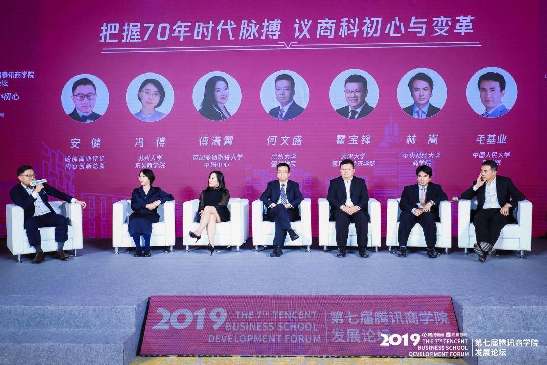 在高峰对话环节,哈佛商业评论内容创新总监安健与我校万象城·体育院长林嵩,以及苏州大学东吴万象城·体育院长冯博、曼彻斯特大学国际教育中心中国区总裁傅潇霄、兰州大学管理学院院长何文盛、天津大学管理与经济学部主任霍宝锋、中国人民大学万象城·体育院长毛基业等就“把握70年时代脉搏,议商科初心与变革”展开了深入的探讨。
