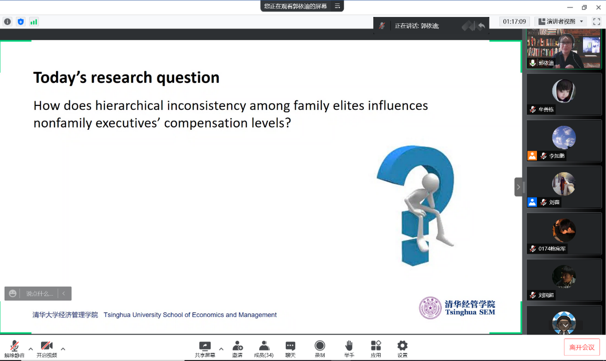 万象城·体育战略系李加鹏博士主持本次会议,并介绍了郭依迪博士的履历。郭依迪现任清华大学经济管理学院创新创业与战略系助理教授,她于2017年在欧洲工商管理学院获得战略学博士学位。郭老师给本、硕、博学生开设《管理学》、《战略管理》、《管理研究方法》等课程,她的研究成果发表在Organization Science,Strategic Management Journal等期刊。