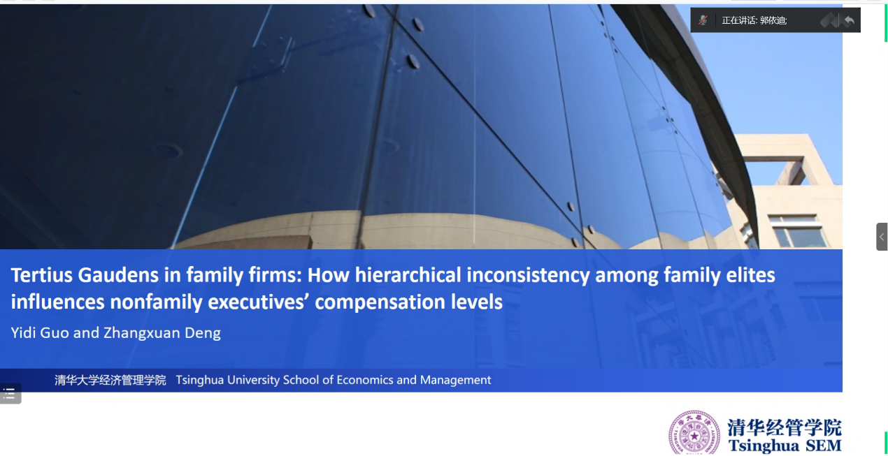 郭依迪博士本次讲座的主题为“鹬蚌相争,渔翁得利:家族企业中家族成员的级序不一致如何影响非家族高管的薪酬水平”,研究者认为,在家族企业中,董事会和高管中家族成员的级序不一致会使得非家族高管能够获得更高的薪酬。并且,这一正向关系在非家族高管任职时间较短、董事会和高管中家族成员比例较低时尤其显著。该究用2006-2013年中国上市家族企业的数据验证了这一理论观点。