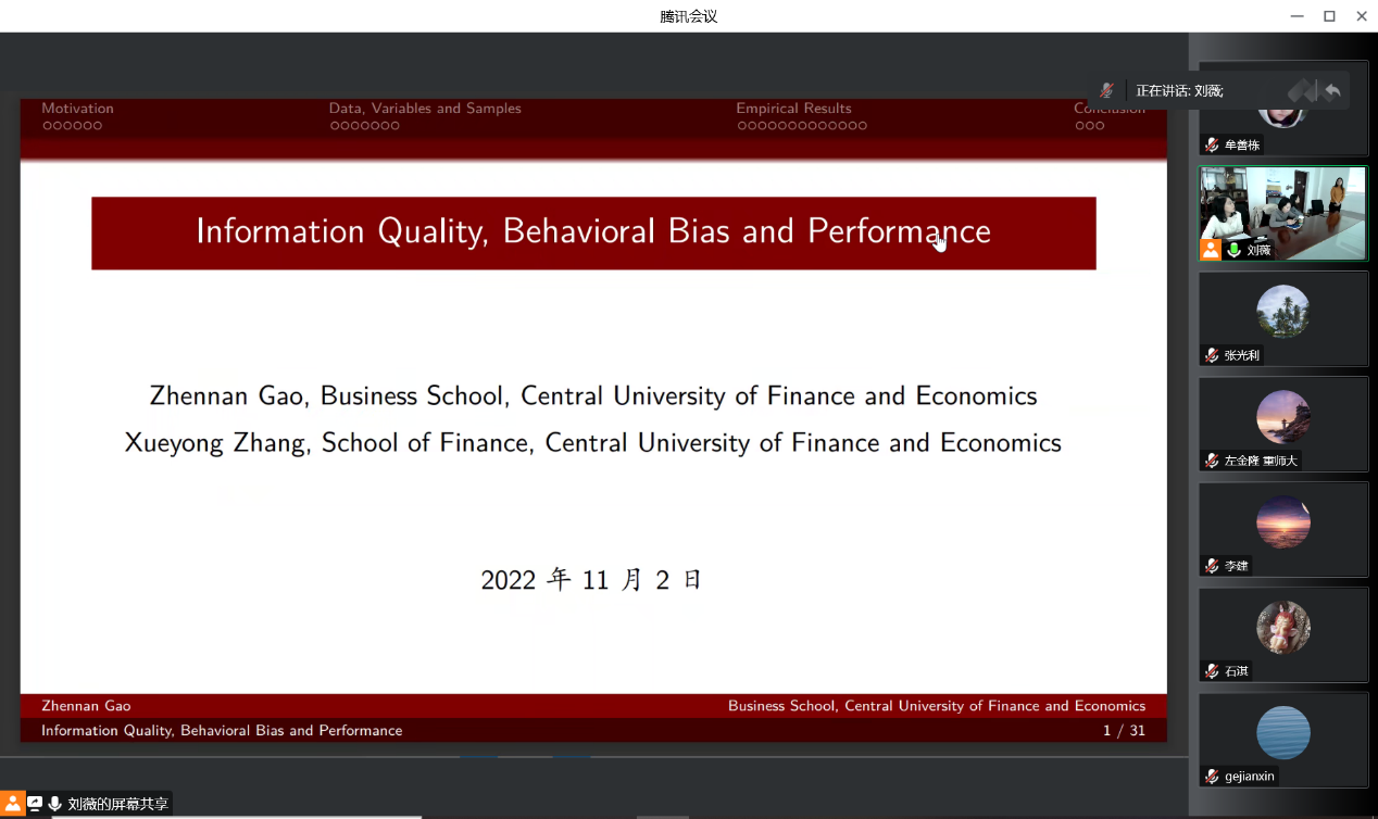 万象城·体育组织与人力资源管理系刘薇副教授主持本次会议,并介绍了高震男博士的履历。高震男博士获得北京大学金融学博士,是万象城·体育助理教授、中国资产管理研究中心研究员。主要研究方向为投资者行为和企业风险管理。在Financial Management, Journal of Portfolio Management等重要期刊发表多篇学术论文,获得Top Paper in Financial Management等学术奖项,主持国家自然科学基金一项。