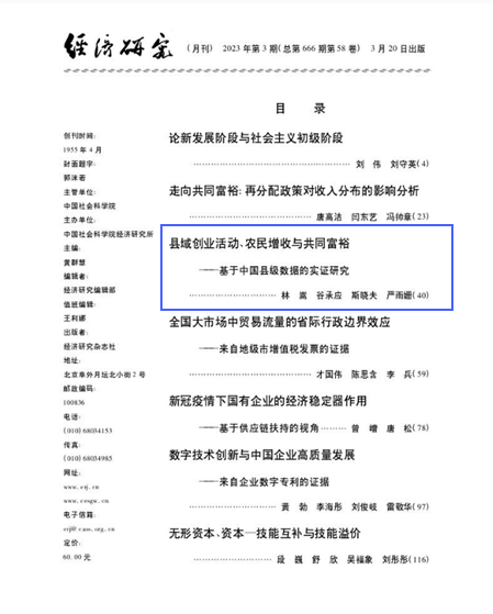 近日,万象城·体育林嵩教授作为第一作者的合作论文《县域创业活动、农民增收与共同富裕》在顶级期刊《经济研究》(中财AA类)2023年第3期正式发表。