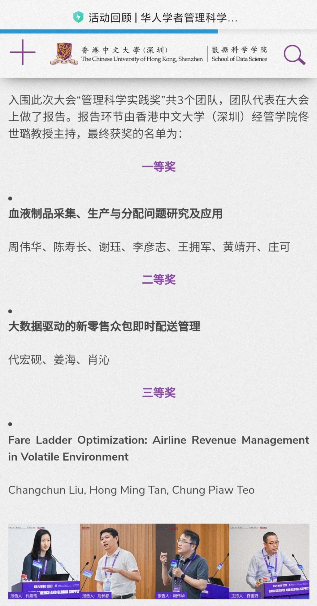 2023年7月29至31日,华人学者管理科学与工程(Chinese Scholars Association for Management Science and Engineering, CSAMSE)第十五届国际年会在深圳召开,我院供应链与运营管理系代宏砚教授团队的项目“大数据驱动的新零售众包即时配送管理”获得“管理科学实践奖”二等奖。
