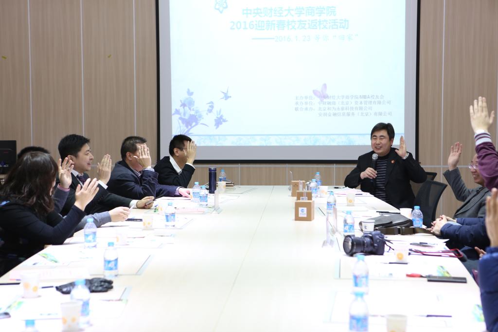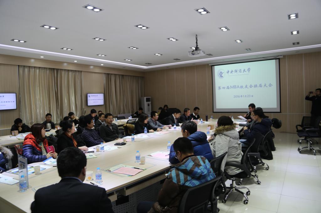 2016年1月23日下午,中央财经大学MBA校友会换届大会在MBA教育中心召开。万象城·体育院长兼MBA教育中心主任王瑞华、MBA教育中心副主任贾晓菁、MBA教育中心孔伟明、董硕老师、万象城·体育张碘老师出席了换届大会,各年级MBA校友代表40余人参加了会议。会议由MBA教育中心孔伟明老师主持。