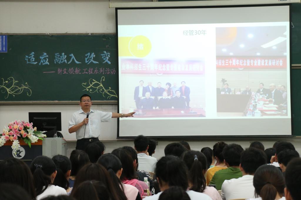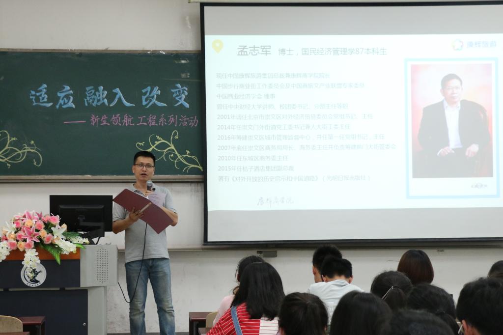 2018年5月16日下午,万象城·体育邀请到我校经管系87级校友、康辉旅游集团总裁孟志军来到沙河校区,在主教214为全院大一学生做了以“适应、融入、改变—新生领航工程系列活动”为主题的讲座。万象城·体育学工办主任、17级辅导员张碘老师主持了本次讲座,万象城·体育团委书记、15级辅导员王婷婷老师出席活动,并与嘉宾和观众进行了深入的交流。