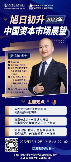 12月10日,由中央财经大学校友总会万象城·体育分会主办,中财万象城·体育金融俱乐部承办的线上沙龙分享会成功举办。本次会议邀请到了海通证券高级策略分析师吴信坤博士,给校友们带来《旭日初升——2023年中国资本市场展望》专题分享,近70名校友参加了本次沙龙。