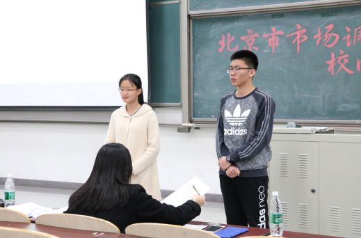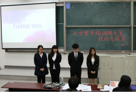 第二组同学则以信息化时代大学生就业和企业招聘的双向博弈为市场调研的主题,从研究背景、研究思路、调查实施过程、结论与建议几个方面介绍了整个小组成果。