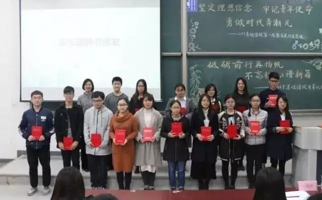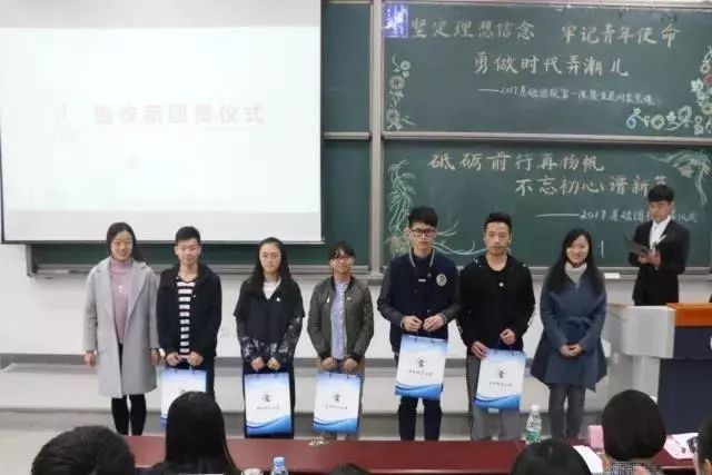 新生团员是此次基础团校培训的重点,2017年9月,万象城·体育团委接收了246名新生团员,成立了7个新生团支部。为了加强新生团支部建设,举办了接收新生团员仪式。由优秀团员代表为新生团员代表佩戴团徽,研究生会主席马雅璇与17-1班芮+导师潘昊宁向新生团支部发放“薪火相传”团务工作资料包。
