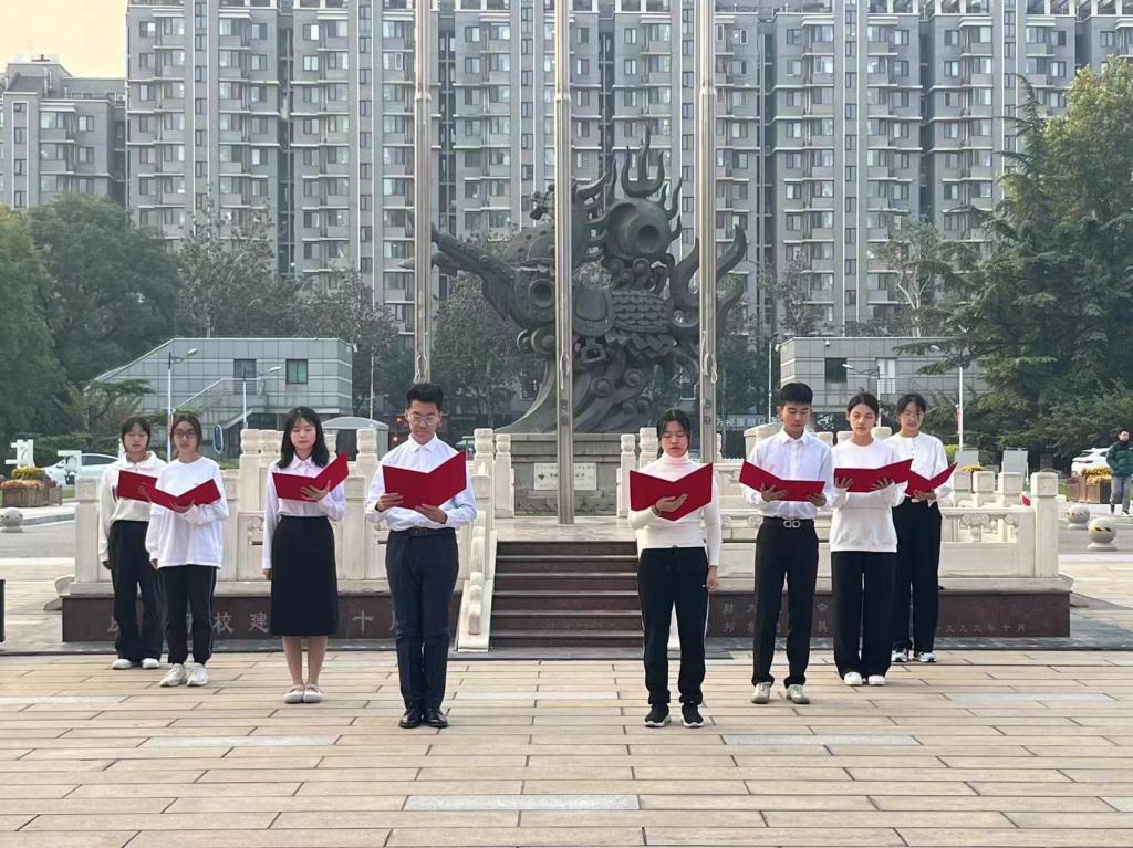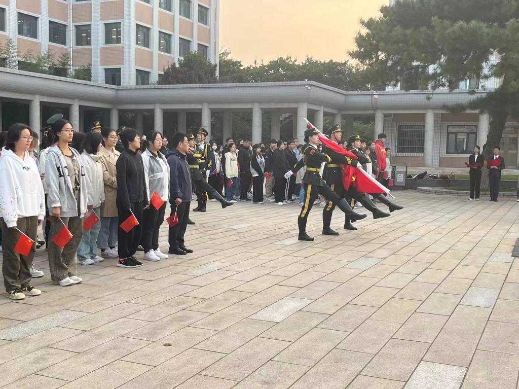 7点整,曦光微明,伴着十月的阵阵秋风,国旗队旗手们迈着坚定有力的步伐走到升旗台前,落地铿锵,整齐划一,随后国歌响起,在激昂的歌声中,在晨曦的照耀下,五星红旗缓缓升起,随风飘扬,全体师生行注目礼,共唱国歌。