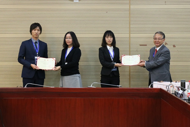 第二环节结束后,与会评委对学生展示进行了点评,中央财经大学戴晓天的《3D printing cloud classroom》和大阪商业大学藤川功基的《日本纸》获得本次国际交流会的最佳展示奖,安室宪一教授和葛建新教授分别对获奖同学颁发了证书。整个会议由中方周卫中教授、柴庆春副教授,日方孙飞舟教授、阎和平教授全程翻译。