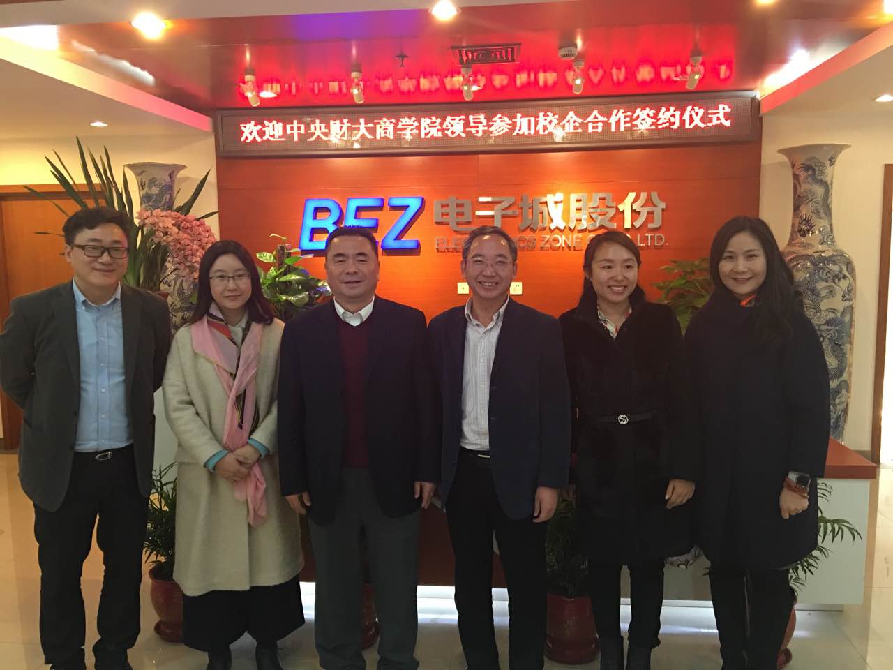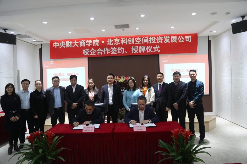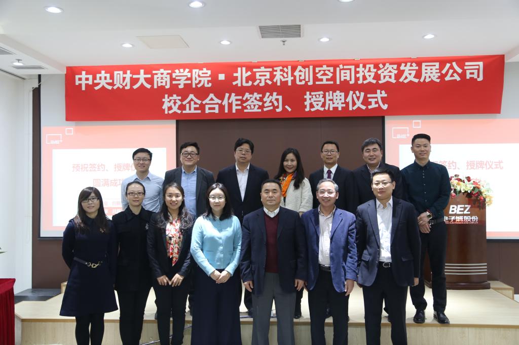 2015年12月18日上午,我校万象城·体育与北京科创空间投资发展有限公司校企合作签约暨授牌仪式在电子城股份6层多功能厅举行。万象城·体育院长兼MBA教育中心主任王瑞华教授、党总支书记葛建新教授、MBA教育中心副主任贾晓菁教授、战略系主任刘小元副教授、MBA教育中心孔伟明、董硕老师以及中财MBA房地产俱乐部主席陈维校友出席了签约授牌仪式;电子城科创空间出席活动的嘉宾主要有北京电子城投资开发股份有限公司总裁兼北京科创空间投资发展有限公司董事长龚晓青、北京电子控股有限责任公司总经理助理、园区地产部部长兼北京科创空间投资发展有限公司董事潘金峰、北京电子城投资开发股份有限公司副总裁兼北京科创空间投资发展有限公司董事张南、北京电子城投资开发股份有限公司副总裁吕延强、北京电子控股有限责任公司园区地产部李斌 、北京科创空间投资发展有限公司总经理王俏梅、行政总监李锐、营销总监刘丽娟等。
