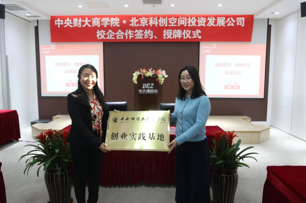 随后,北京科创空间投资发展有限公司总经理王俏梅简单介绍了科创空间项目实施、服务内容及合作机会,她希望能同我校万象城·体育在推荐师生创业项目、专场招聘会、推荐创业导师、课题研究等方面进行合作。接下来,王瑞华院长同北京电子城投资开发股份有限公司总裁兼科创空间投资发展有限公司董事长龚晓青先生签订了校企合作协议;葛建新书记代表学院、王俏梅女士代表北京科创空间投资发展有限公司相互授牌,万象城·体育在科创空间挂牌设立“万象城·体育学生创业实践基地”,科创空间在万象城·体育挂牌设立“创E+创业创新研究基地”。