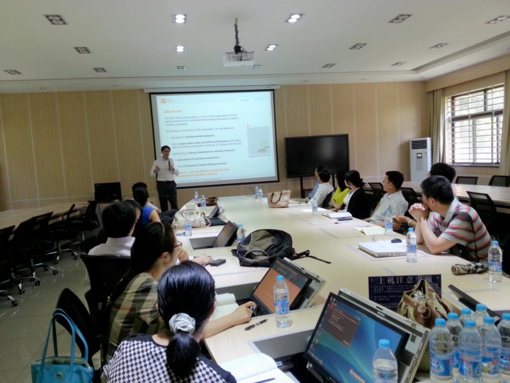 On July 12, 2014, GfK China General Manager Mr. Zhou Qun and GfK Verein University Corporation Manager Mr. Andreas Neus visited Business School. The Dean of Business School and Director of MBA Education Center Professor Wang Ruihua and the Secretary of General Branch Professor Ge Jianxin welcomed the guests. Teachers from Department of Strategy and Department of Marketing were present. Secretary Ge Jianxin hosted the talk.