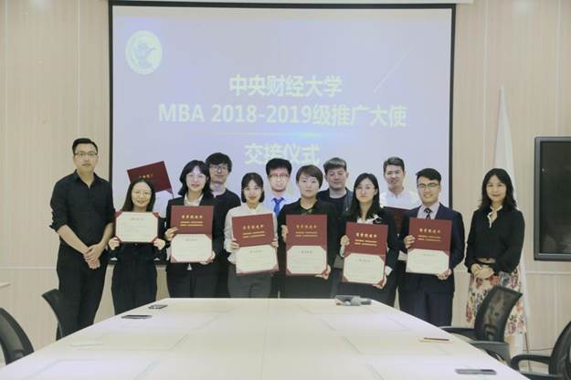 In the fascinating month of May, CentralUniversity of Finance and Economics (CUFE) successfully held the 2018-2019 CUFEMBA Campus Ambassador Handoff Ceremony at Room A02 of the MBA Education Center.Professor Jia Xiaojing, Deputy Director of the CUFE MBA Education Center, andteachers from the Project Development Office, including HuangJixin, Luan Tian and Liu Xinfeng, attended the occasion upon invitation. Headof the 2019 campus ambassador group Wang Yuanyuan presided over the event.