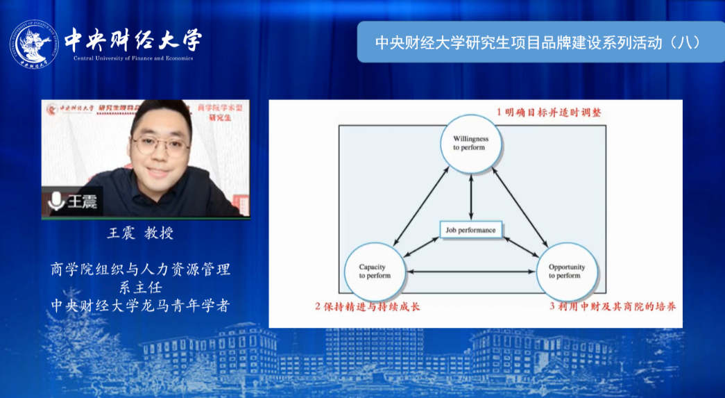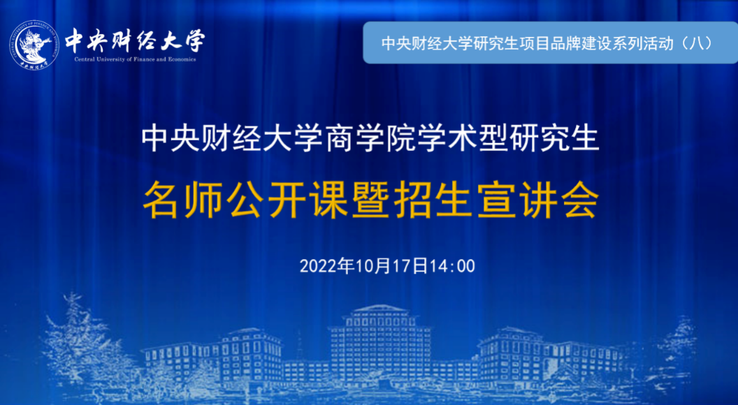 In order to effectively promote the connotative development of graduate education and project brand building at Central University of Finance and Economics, and continuously improve the quality of graduate students, the “Central University of Finance and Economics (CUFE) Graduate Program Brand Building Series (VIII) - The Business School’s Open Class and Enrollment Seminar for Academic Graduate Students” jointly organized by the Graduate School and the Business School was successfully held on the cloud on the afternoon of October 17.