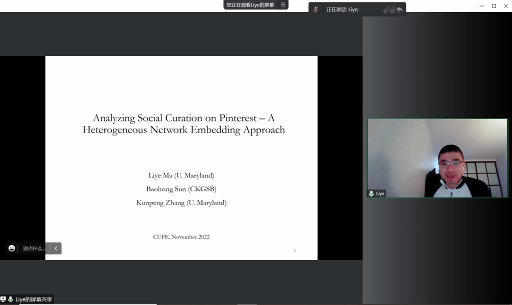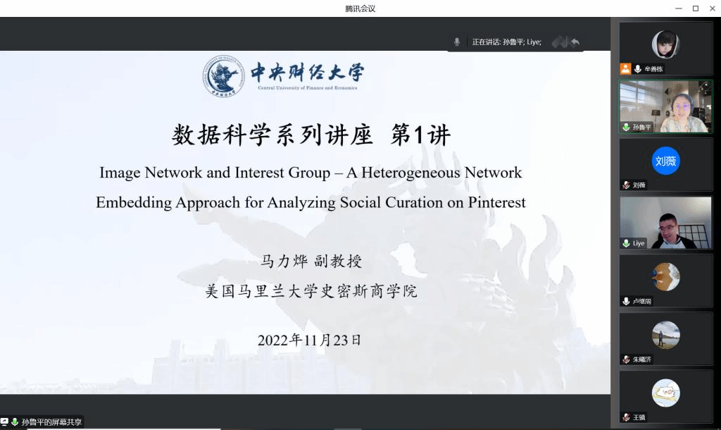 At 10:00 a.m., November 23, 2022, the Business School of Central University of Finance and Economics (CUFE) held the 19th Session of the Excellent Academic Forum Lecture Series and the 1st Session of the Data Science Lecture Series online through Tencent Meeting. Associate professor Ma Liye from the Robert H.Smith School of Business, University of Maryland was invited as the keynote speaker of this lecture, and more than 30 people (including teachers, master and doctoral students, and undergraduate students) attended this lecture.