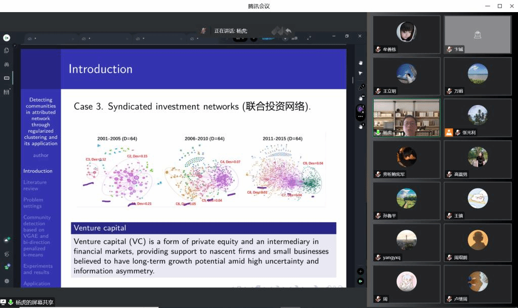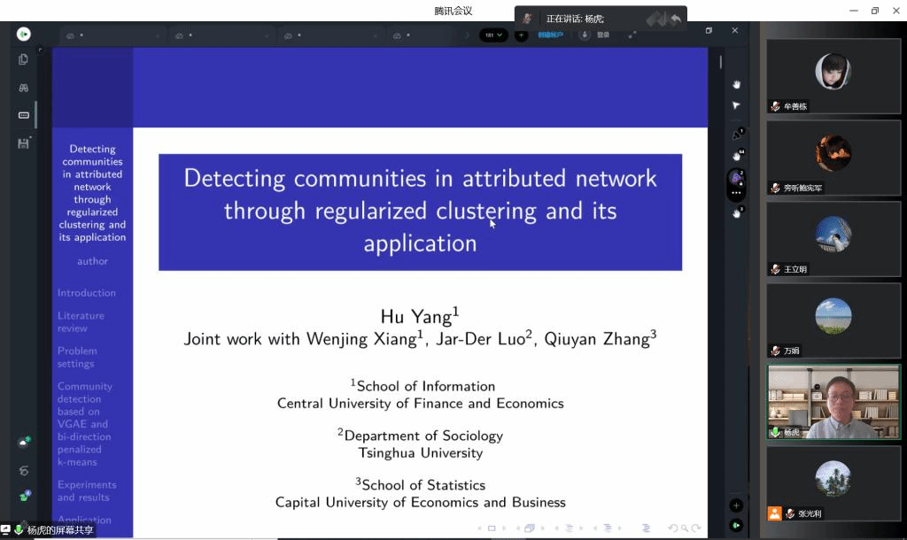The topic of associate professor Yang Hu’s lecture is “Detecting Communities in the Attributed Network through Regularized Clustering and Its Application”. This research proposes a learning framework for community discovery in complex social networks, which effectively addresses the challenges and technical difficulties in the selection of network embedding dimensions and the determination of the number of communities. This framework can automatically determine the number of embedding dimensions and the number of communities by optimizing the regularized K-means. Besides, this research also provides algorithms and statistical proofs, which have been applied to the analysis of China's investment network data, confirming the effectiveness of this method.