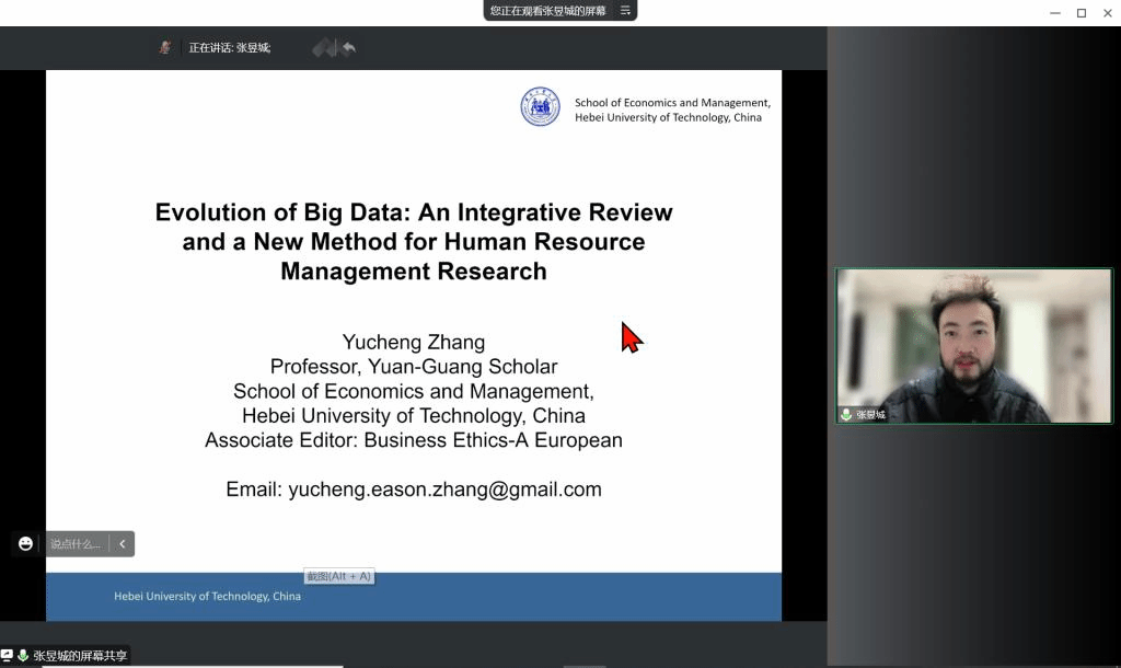 The topic of the lecture delivered by Professor Zhang is “Big Data and Human Resource Management Research: An Integrative Review and New Directions for Future Research”. Although scholars have realized the importance of applying big data methods in human resource management research, there is a lack of clear guidance on how to effectively combine big data methods with human resource management research. First, Professor Zhang adopted a clustering algorithm based on the big data research paradigm to conduct bibliometric analysis, and quantitatively evaluated and scientifically depicted the evolution of the current literature in the field of big data human resource management. Based on this systematic review, he proposed a general theoretical framework, which as described as “induction (predictive paradigm: data mining/theory building) vs. deduction (explanatory paradigm: theory testing)”. In this framework, he discussed potential research questions, corresponding analysis levels, relevant methods, data sources and software. Then, he summarized the general process of conducting big data research in human resource management research. Finally, he proposed the future agenda of applying big data methods to human resource management research, and identified five promising human resource management research topics at micro, meso and macro levels, as well as the challenges and limitations that human resource management scholars may face in the era of big data.