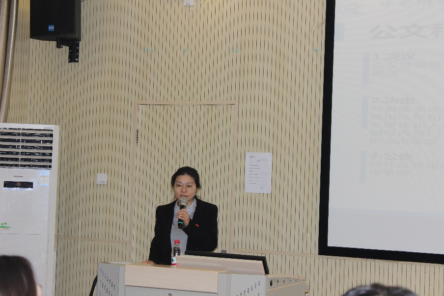 Liu Xing, deputy director of the school office, was invited to give lectures during this training. Based on the requirements of official document writing and combined with his own work experience, Liu Xing systematically taught the knowledge in terms of official document and message writing, explained the main characteristics, standardized writing, precautions, and confusing concepts of commonly used official documents and messages such as notices, requests, reports and minutes in details, and conducted in-depth analysis on the basis of typical cases in his work.