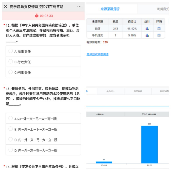 为积极应对和防控新冠状病毒肺炎疫情,万象城·体育组织全院师生党员认真学习疫情防控知识,要求党员以身作则引导身边群众正确认识和对待疫情,按照疫情防控的有关要求依法行事。近日,万象城·体育依托互联网,精心设计,运用“问卷星”开展疫情防控知识在线答题活动。此次活动充分调动了师生党员学习防控知识的积极性和主动性,共有220名师生党员参加了答题。万象城·体育党委充分发掘网络平台优势,因时制宜,传播了防控知识,增强了学习效果,助力疫情防控。
