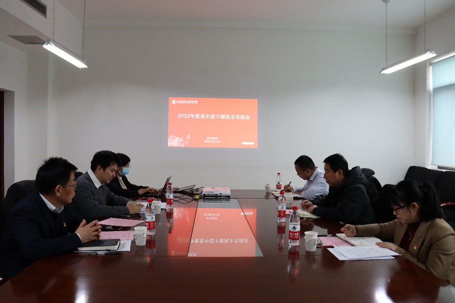 会上,学院党委书记李跃新通报了学院党史学习教育专题民主生活会整改措施落实情况和本次民主生活会征求意见情况。院长林嵩代表学院领导班子进行对照检查,查摆存在问题,分析原因并提出了整改措施。党员中层干部严格按照“六个带头”,把自己摆进去,把职责摆进去,把工作摆进去,逐一进行了个人检视剖析发言,严肃开展批评与自我批评,贯彻“团结-批评-团结”的方针,认真提意见、诚恳谈看法,达到了统一思想、凝聚共识、增进团结、促进工作的目的。