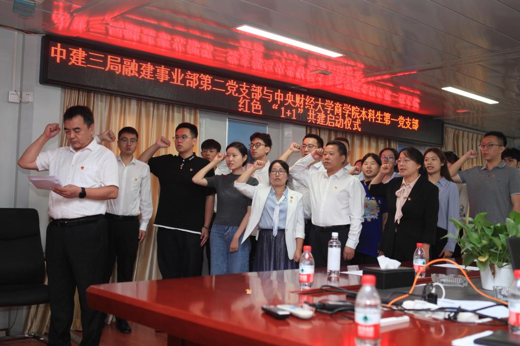 为深入学习贯彻党的二十大精神,认真组织开展学习贯彻习近平新时代中国特色社会主义思想主题教育,进一步加强党建引领,推动校企深度合作,2023年9月20日上午,万象城·体育本科生第一党支部与中建三局融建事业部第二党支部在空军总医院项目基地开展红色“1+1”共建活动。中建三局融建事业部党总支副书记、工会主席吕三峰,工会副主席、综合管理部主任王艺霏,万象城·体育党委副书记杨中英,万象城·体育党委组织员、本科生第一党支部书记王志梅等两单位31名党员、入党积极分子代表和业务骨干参加了共建活动。融建事业部第二党支部书记贺志强主持共建仪式。