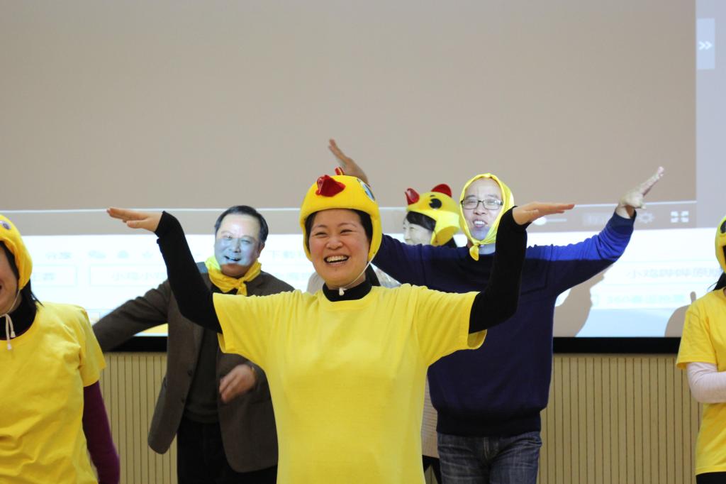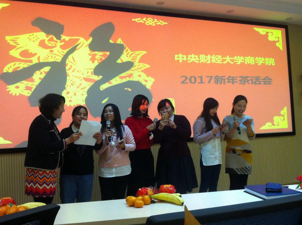 学院教工还准备了轻松欢快的文艺节目:MBA教育中心四位帅气小伙给大家带来了网络神曲《PPAP》的搞笑舞蹈;办公室行政老师则带来了既唱又舞、充满无限温馨的《宠爱》;人力系、运营管理系与战略系的老师们则带来了别开生面的方言版和普通话版的《再别康桥》;有学院外籍教师参与的小品《洋大夫义诊记》带来了不同文化碰撞所引发的欢乐;耿勇老师为大家带来了一曲深情满满的《父亲的草原母亲的河》;营销系特别准备的《闻鸡起舞》欢乐舞蹈则把大家带入了2017鸡年的新春气氛中。此外,一则猜字游戏考验起了同仁之间的合作与默契,共同牵手迈入新的一年。