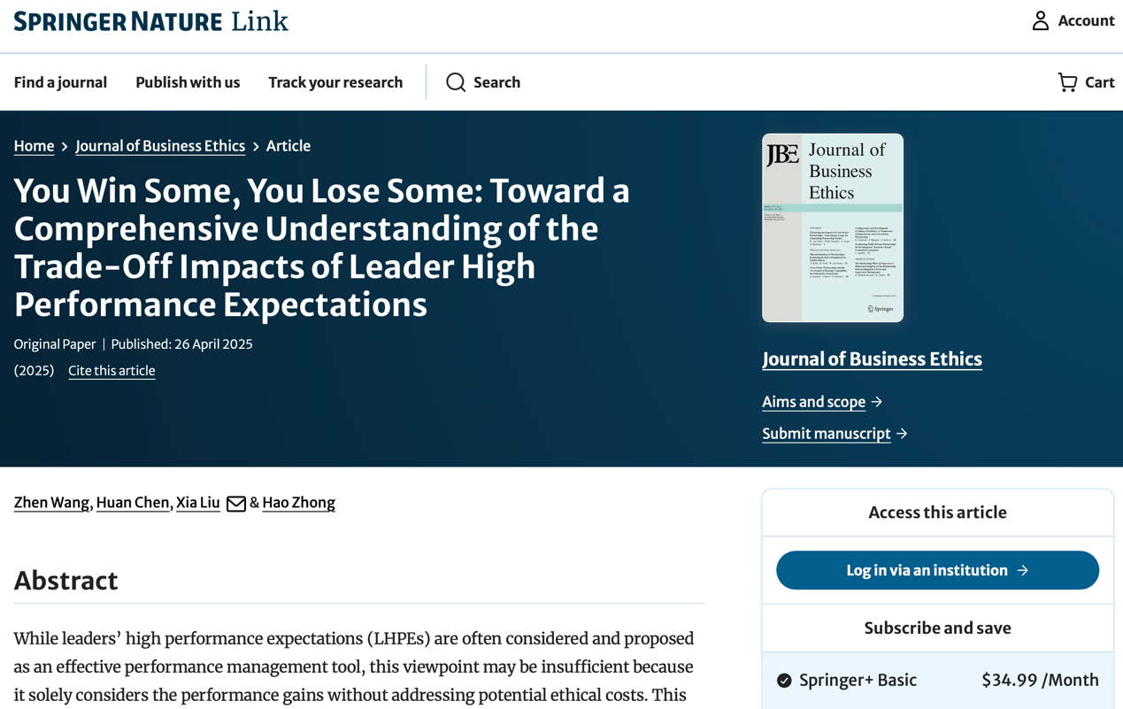 近日,我院王震教授牵头的论文“You Win Some, You Lose Some: Toward a Comprehensive Understanding of the Trade-Off Impacts of Leader High Performance Expectations”被Journal of Business Ethics接受并在线发表。该论文是王震教授以我院教师身份在FT50期刊上发表的第10篇研究成果,此前的成果已发表在 Journal of Applied Psychology(JAP)、Organizational Behavior and Human Decision Processes(OBHDP)、Human Relat...